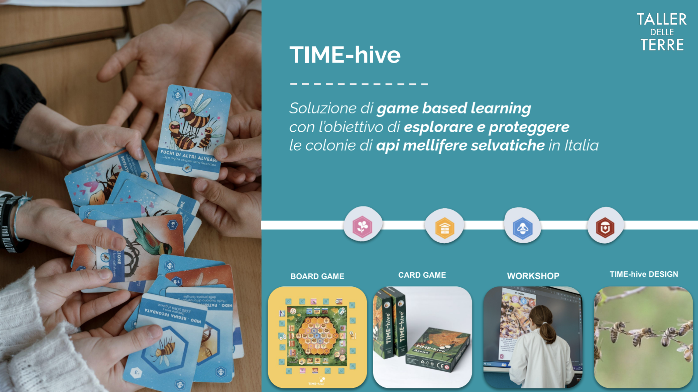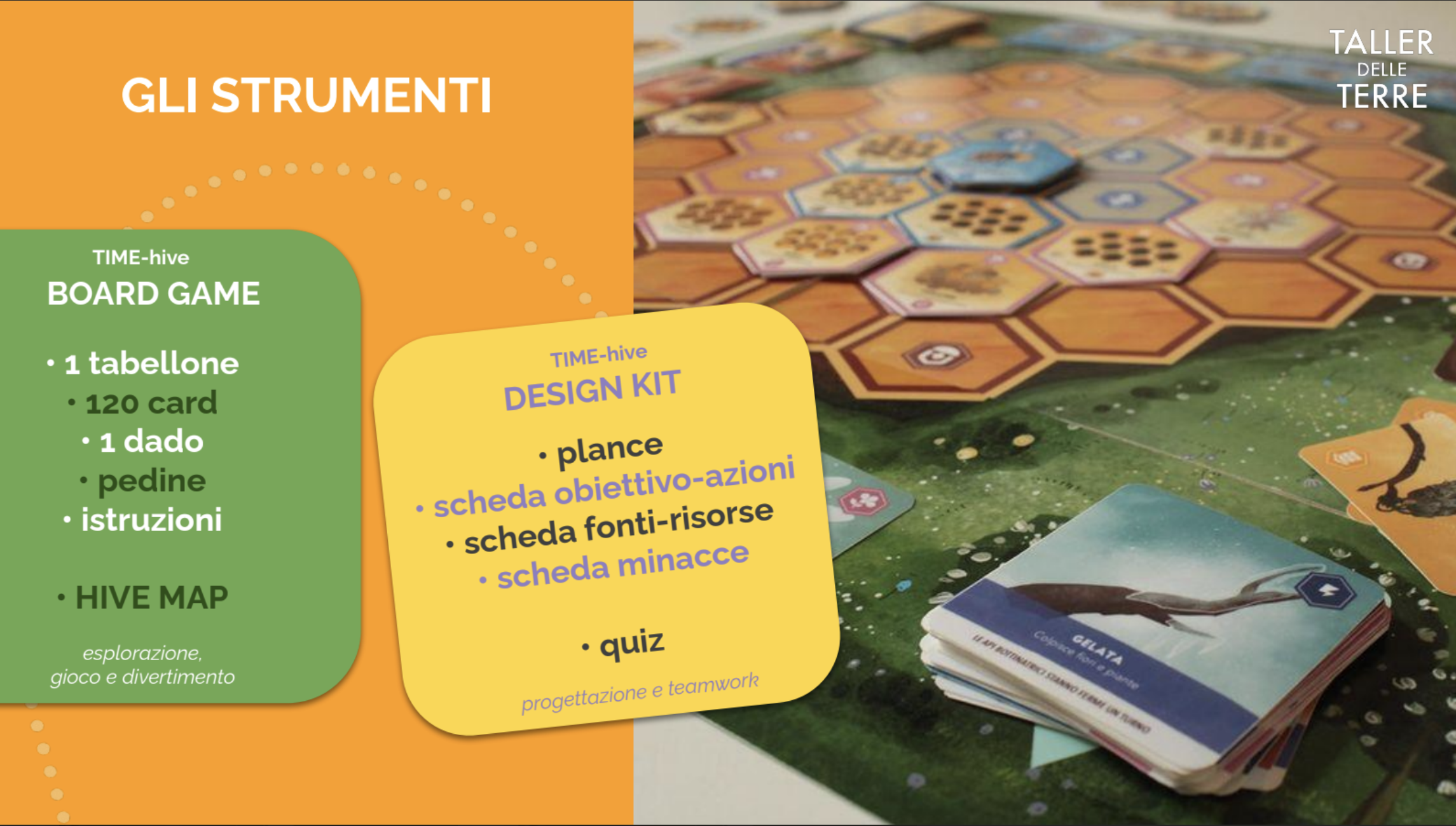 Per questo abbiamo ideato un kit di progettazione: TIME-hive Design per portare il modello dell’alveare nella progettazione. Attraverso il gioco e strumenti di progettazione ispirati al mondo dell’alveare , guidiamo attività formative